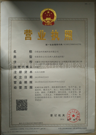 合肥益科機械科技有限公司主要經營:機械設備及配件、消防器材及配件、電子產品、金屬材料、模具生產、加工、制造及銷售;電子產品安裝;鋼材、汽摩配件、通信設備、五金交電、建筑材料、工藝禮品、不銹鋼材料銷售。公司尊崇“踏實、拼搏、責任”的企業精神,并以誠信、共贏、開創經營理念,創造良好的企業環境,以全新的管理模式,完善的技術,周到的服務,卓越的品質為生存根本,我們始終堅持用戶至上 用心服務于客戶,堅持用自己的服務去打動客戶。 歡迎各位新老客戶來我公司參觀指導工作,我公司具體的地址是:安徽省合肥市經開區桃花鎮湯口路[查看詳情]